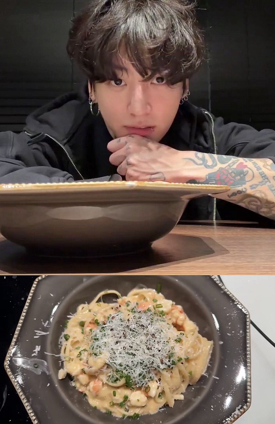 정국은 씻어둔 대왕 새우를 카메라에 보여주며 장난스러운 표정을 짓더니, 새우 머리와 몸통을 분리하고 껍질을 깔끔하게 제거한 뒤 큼직하게 썰어 준비를 마쳤다. 이후 올리브유를 두른 팬에 쪽파와 새우 머리를 넣어 파기름을 낸 뒤, 마늘과 페페론치노, 후추를 차례로 넣어 볶으며 “색깔이 너무 이쁘죠?”라며 흐뭇하게 미소를 지었다.