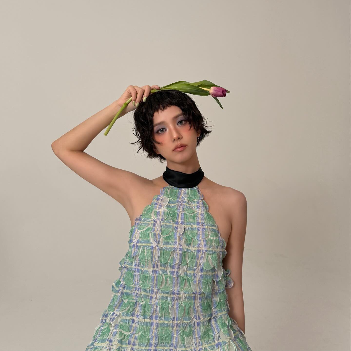 지수는 24일 소셜미디어에 튤립 이모티콘과 함께 화보 촬영 비하인드 사진 여러 장을 공개했다. 사진 속 지수는 짧고 컬이 들어간 새로운 헤어스타일을 선보이며 색다른 매력을 발산했다. 민트·블루 톤의 홀터 드레스를 착용한 채 튤립 한 송이를 들고 있는 모습은 몽환적인 분위기를 자아낸다.