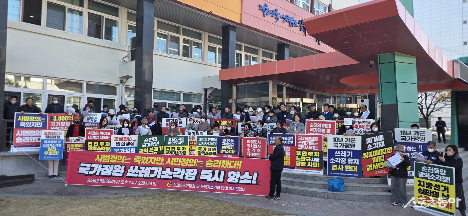 순천만국가정원 옆 쓰레기소각장 반대 범시민연대’는 지난 26일 기자회견을 열고 “법원이 폐촉법 규정을 무시한 참담하고 부조리한 판결을 내렸다”며 즉각 항소 방침을 밝혔다. 사진제공=박기현 기자