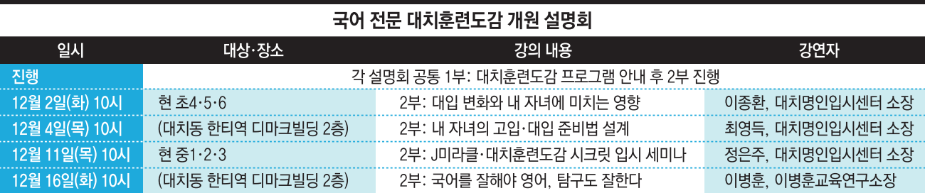 대치훈련도감은 12월 2·4·11·16일 오전 10시 서울 강남구 대치동 한티역 다마크빌딩 2층에서 현재 초등학교 4~6학년, 중학교 1~3학년 학부모를 대상으로 대치훈련도감 개원 설명회(참석 예약 필요)를 개최한다.