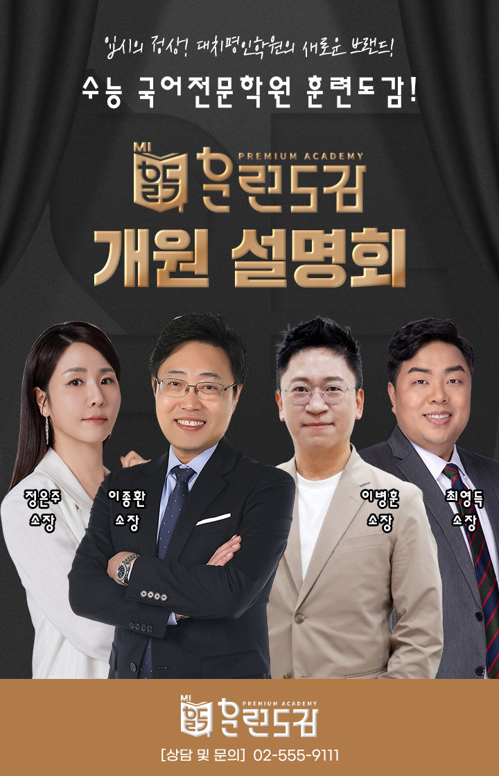 입시교육 명문 ㈜명인에듀(대표 이채연)는 초중고생을 대상으로 국어를 학습 단계별로 체계적으로 가르치는 교육 브랜드 ‘훈련도감’을 론칭하고 본격적인 교육에 들어갔다. 훈련도감은 대치동 본원과 분당 수내동, 파주 운정, 의정부, 검단 캠퍼스에서 운영된다.