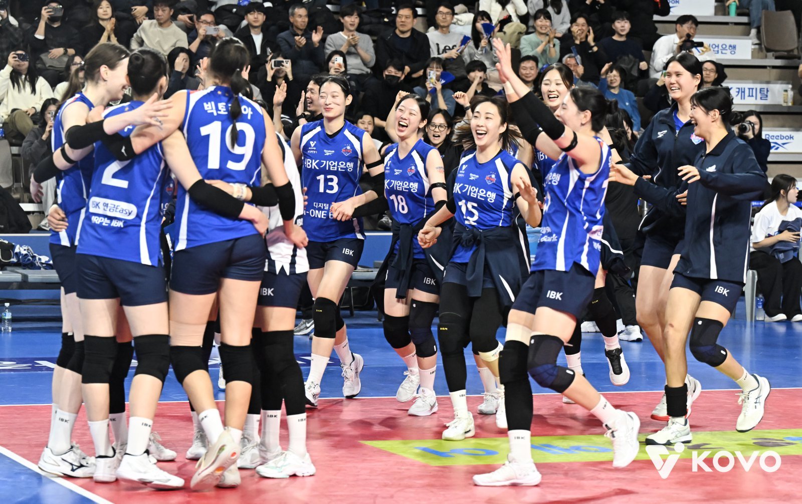 IBK기업은행 선수들이 26일 흥국생명과 홈경기서 승리한 뒤 기뻐하고 있다. 사진제공|KOVO