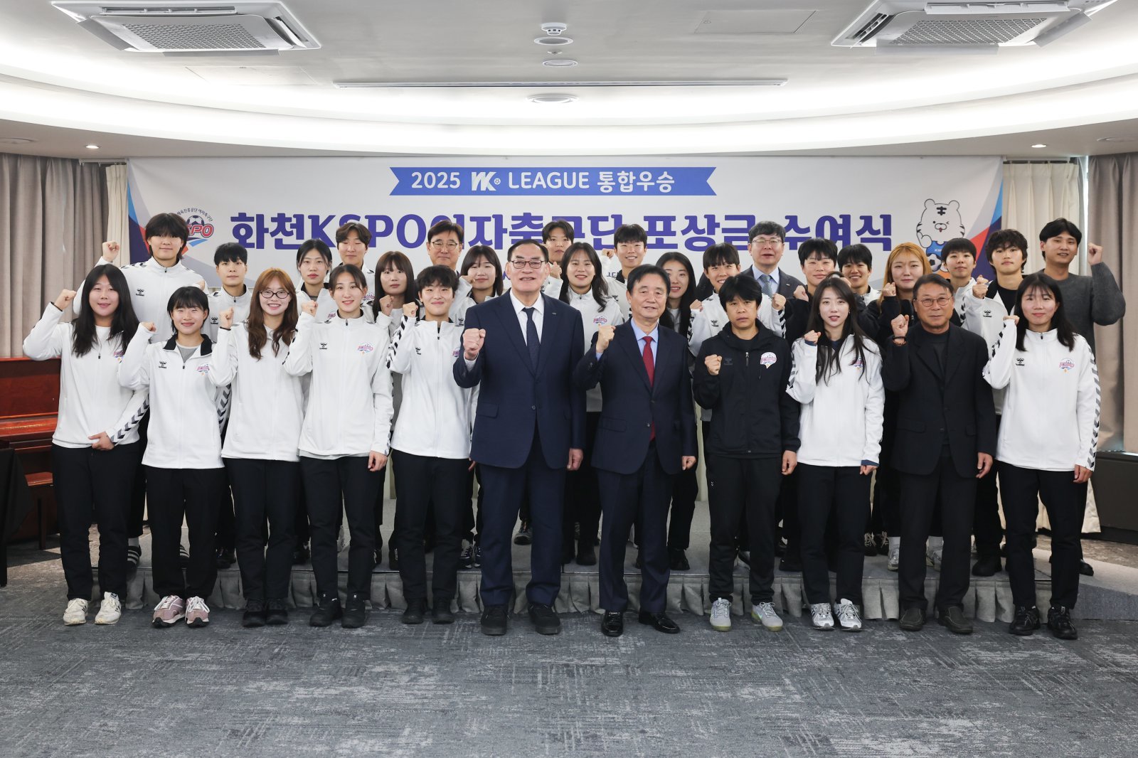서울올림픽기념국민체육진흥공단(이사장 하형주, 이하 체육공단)이 여자 실업 축구팀 최초로 ‘트레블’을 달성하며 ‘2025 WK리그’ 통합우승을 차지한 ‘화천 KSPO 여자축구단’에 포상금 2억780만 원을 지급했다.