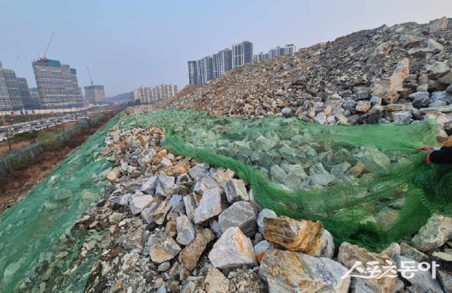 인천 서구에서 진행 중인 가적치장 부지조성 공사현장에서 작업자가 비산먼지 분진망 제거 작업 중 암석에 걸려 넘어져 좌측 손목 골절 부상을 입는 사고가 발생했다(현장). 사진제공|공익 제보자
