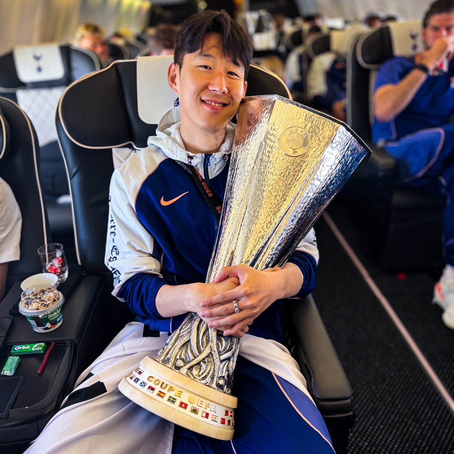 손흥민이 5월 유로파리그 우승 후 트로피를 안고 런던으로 향하는 구단 전세기에서 포즈를 취한 모습. 사진출처|토트넘 홋스퍼 페이스북