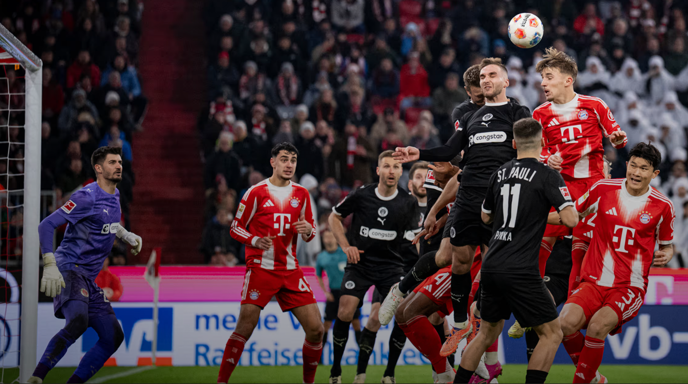 바이에른 뮌헨 김민재(오른쪽 끝)가 30일(한국시간) 독일 알리안츠 아레나에서 열린 장크트 파울리와 홈경기에서 동료들과 공중볼 경합을 하고 있다. 사진출처│바이에른 뮌헨 홈페이지