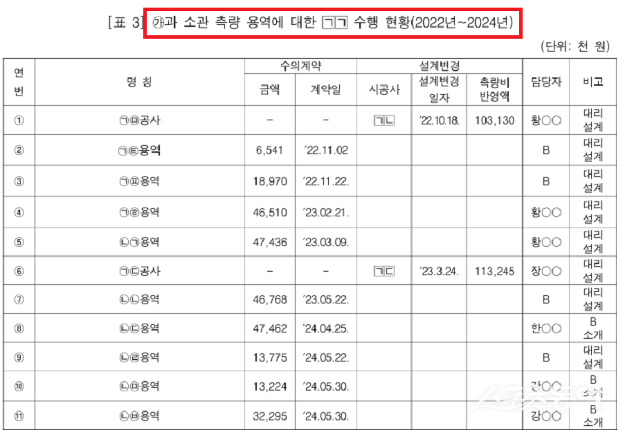 게다가 용역 설계서 일괄 제공 및 특정업체 알선에서는 B는 5건 이상의 측량용역 설계서와 과업지시서를 특정업체로부터 일괄 제공받아 각 사업 담당자 및 시공사에게 배포, 해당 업체가 수의계약을 독점하도록 유도했다. 또 A는 총괄 책임자로서 11건의 측량용역을 객관적 검증 없이 특정 업체에게 집중 승인, 관리·감독 의무를 방기했다.