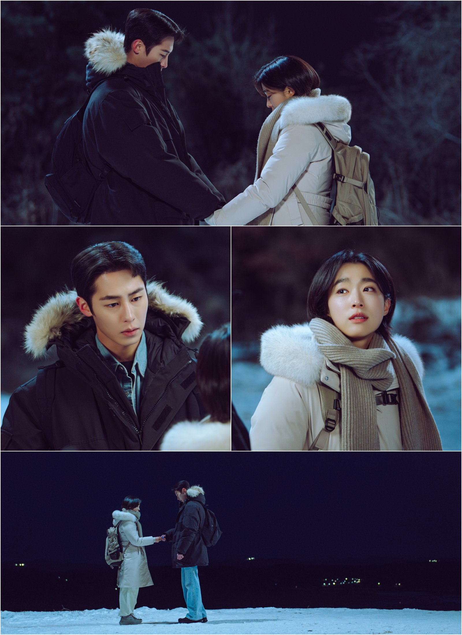 사진에는 차가운 겨울바람이 부는 설산을 배경으로 서로를 마주하고 있는 도하와 하경의 모습이 담겨있다. 두터운 겨울 점퍼 차림의 두 사람은 인적이 드문 산속에서 서로의 온기에 의지한 채 깊은 눈맞춤을 나누고 있다.
