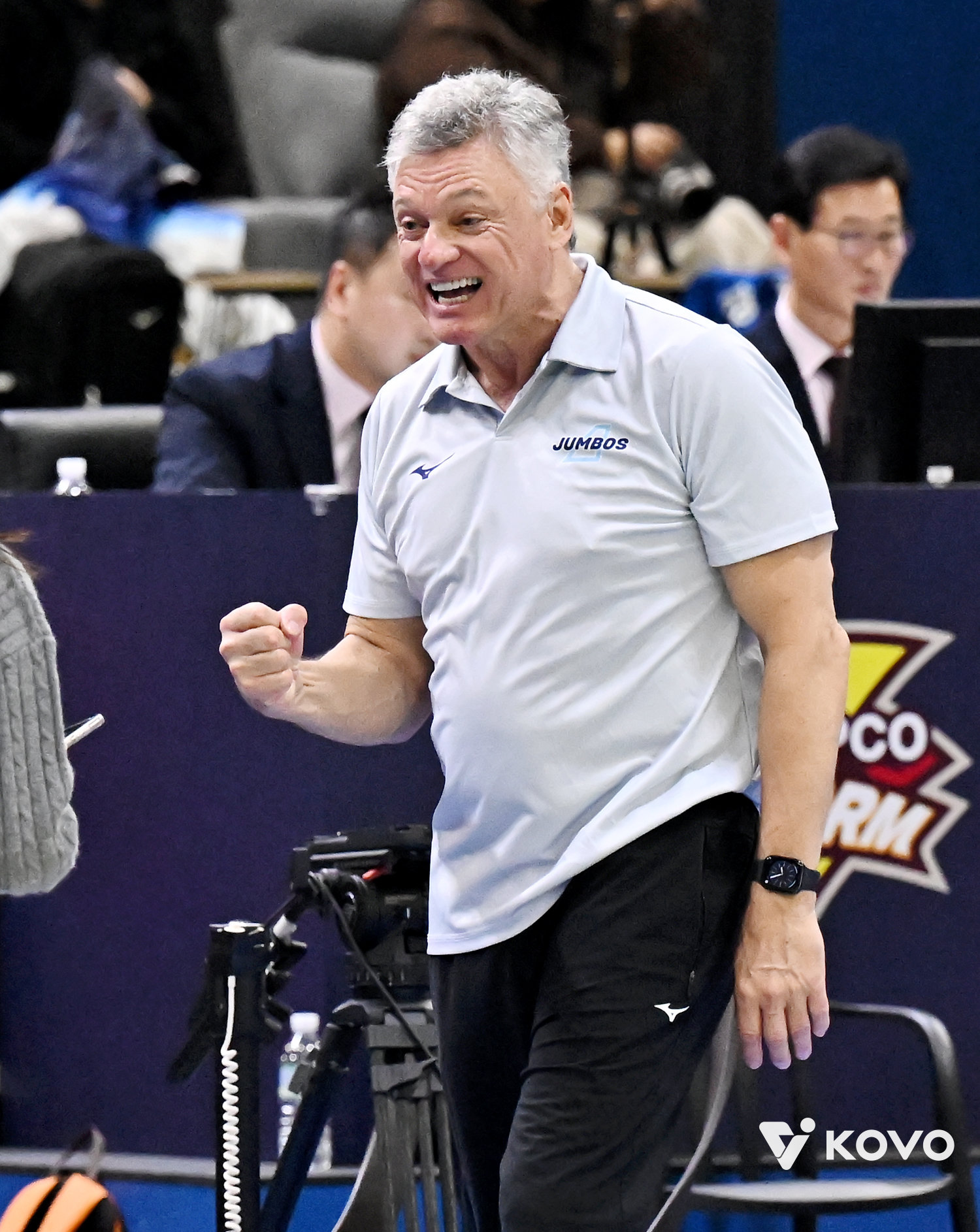 헤난 달 조토 대한항공 감독이 지난달 28일 한국전력과 원정경기서 득점한 뒤 주먹을 쥐고 기뻐하고 있다. 사진제공|KOVO
