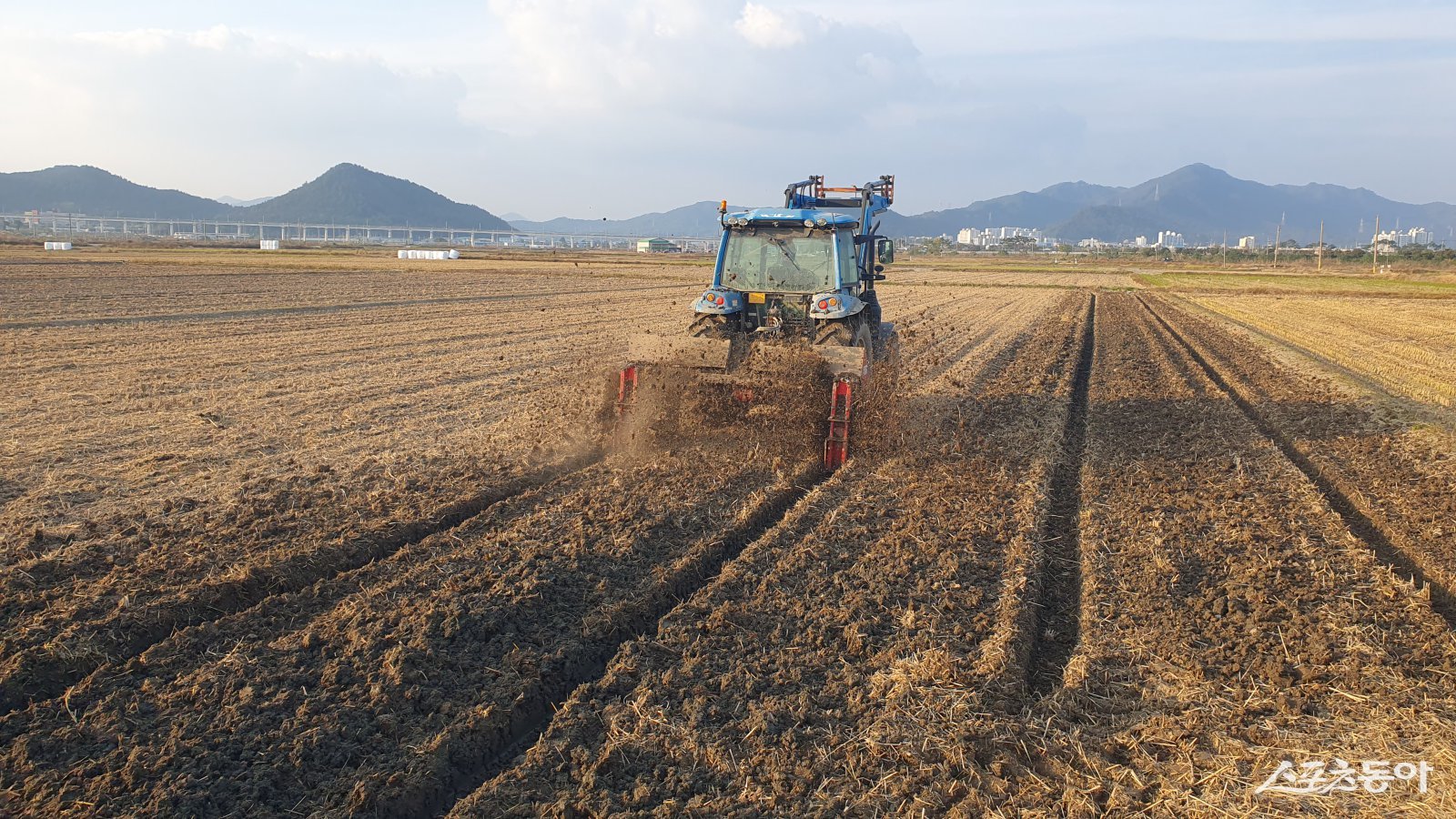 한 농가가 맥류 파종을 하고 배수로를 만들고 있는 모습. 사진제공=강진군