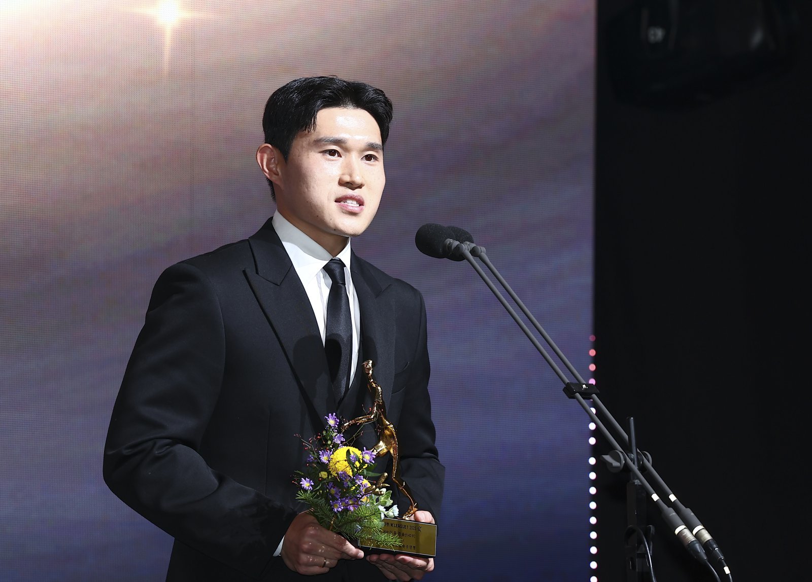 K리그1 MVP를 수상한 울산이동경이 1일 서울 서대문구 스위스 그랜드호텔에서 열린 ‘하나은행 K리그 2025 대상 시상식’에서 수상소감을 말하고 있다. 뉴시스