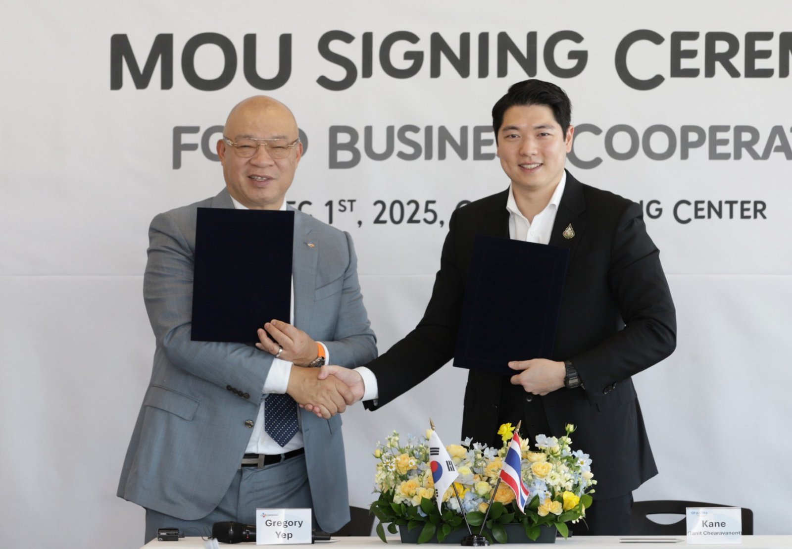 그레고리 옙 CJ제일제당 식품사업부문 대표(왼쪽)와 타닛 치라바논 CP엑스트라 대표가 1일 서울 중구 CJ제일제당 본사에서 MOU를 맺고 있다. 사진제공 |CJ제일제당