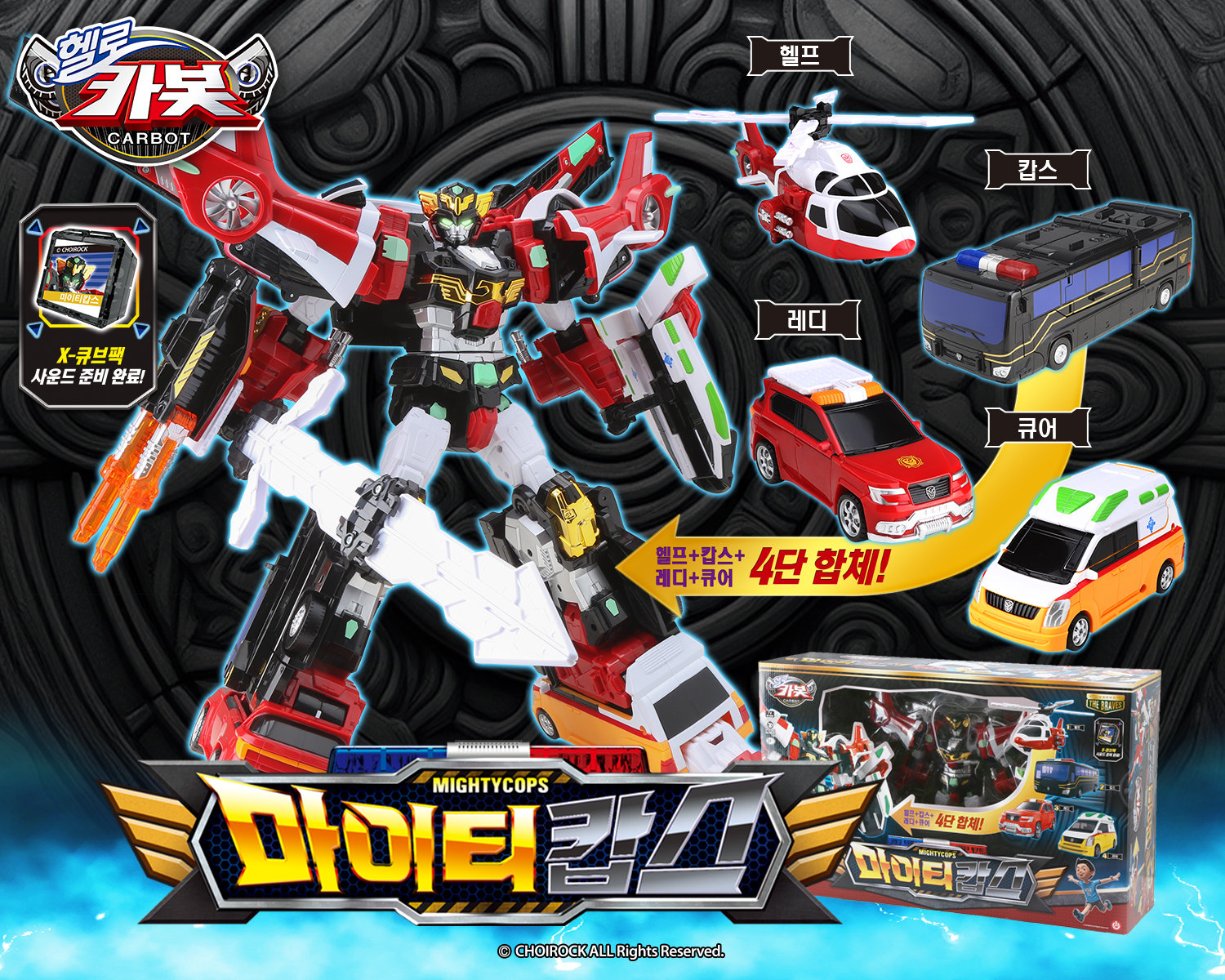 대형 패키지를 열면, 헬프와 캅스가 2단 합체된 본체를 중심으로 좌우에 레디와 큐어가 담긴 블리스터가 나온다. 검은색 캅스를 몸통으로 삼아 헬기의 꼬리 부분을 좌우의 긴 어깨로 변형해 사용하며, 날개 좌우 길이가 45cm에 이르는 이 2단 합체 로봇은 듬직한 몸체로부터 남다른 파워를 뿜어낼 것처럼 보인다.