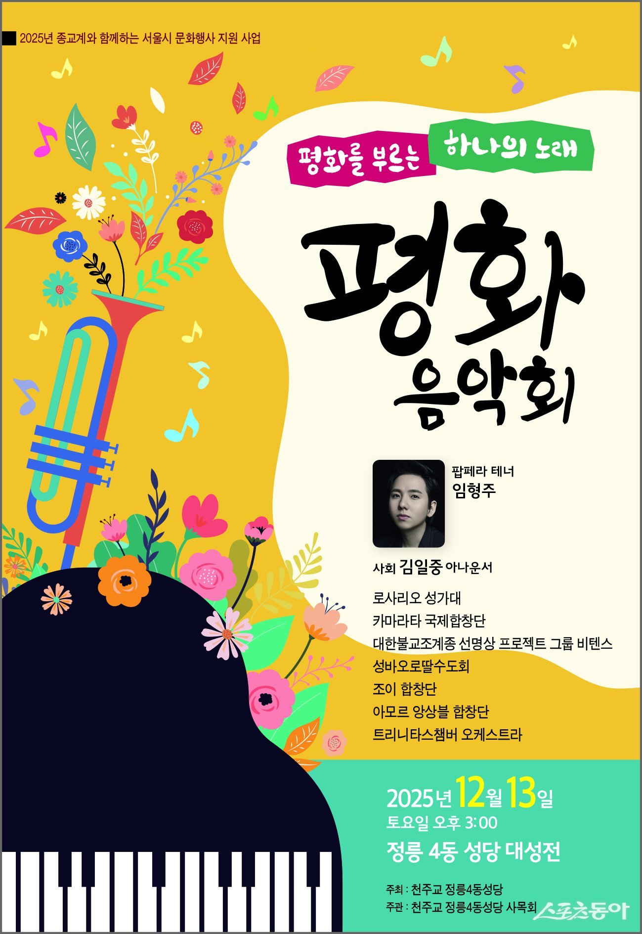 천주교 서울대교구 정릉4동성당은 12월 13일 오후 3시 서울 성북구 정릉4동성당 대성전에서 ‘평화를 부르는 하나의 노래’를 주제로 평화 음악회를 개최한다고 밝혔다.