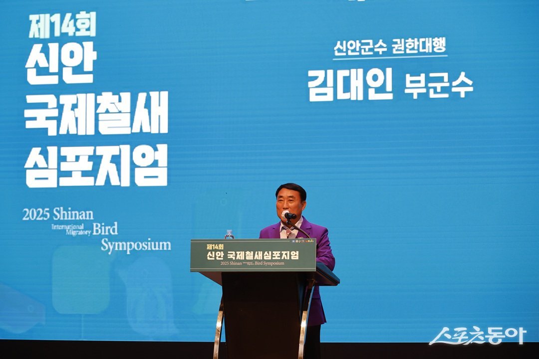김대인 신안군수 권한대행가 최근 자은도 라마다호텔에서 개최한 ‘제14회 신안 국제철새심포지엄’에서 인사말을 하고 있다. 사진제공=신안군
