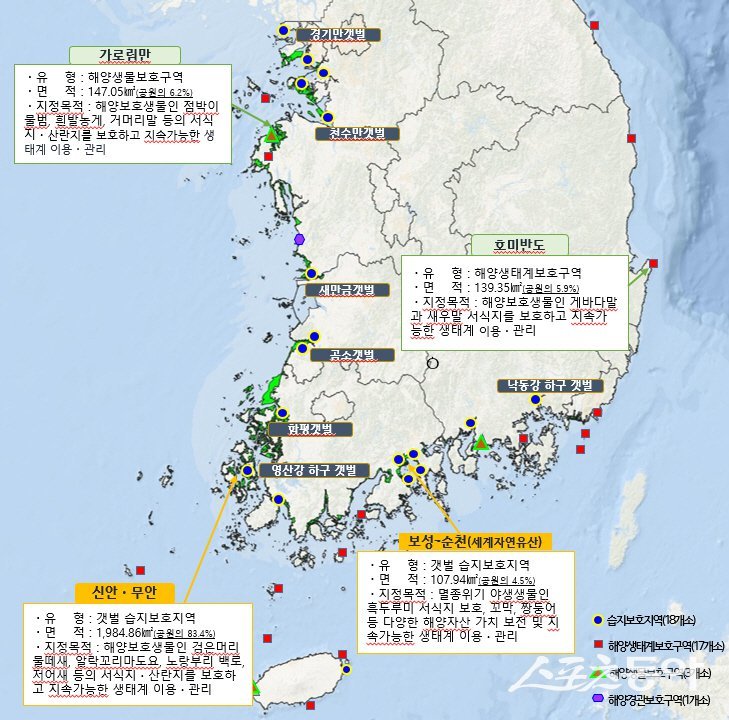특히 전남의 신안·무안공원은 검은머리물떼새, 알락꼬리마도요, 노랑부리 백로, 저어새 등 서식지·산란지 보호로 해양자산의 가치 보전에, 여자만 보성·순천 공원은 멸종위기 야생생물인 흑두루미 서식지 보호와 꼬막, 짱둥어 등의 지속가능한 생태계 이용·관리에 중점을 둔다.