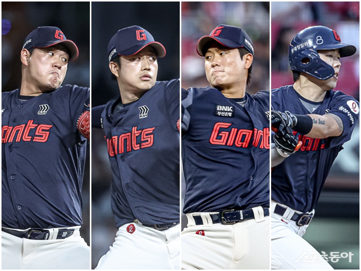 롯데의 내년 시즌 연봉 협상 대상자 중 누가 순풍을 맞을지 주목된다. 올 시즌에는 나균안, 김강현, 정현수, 고승민(왼쪽부터)의 활약이 돋보였다. 사진제공|롯데 자이언츠