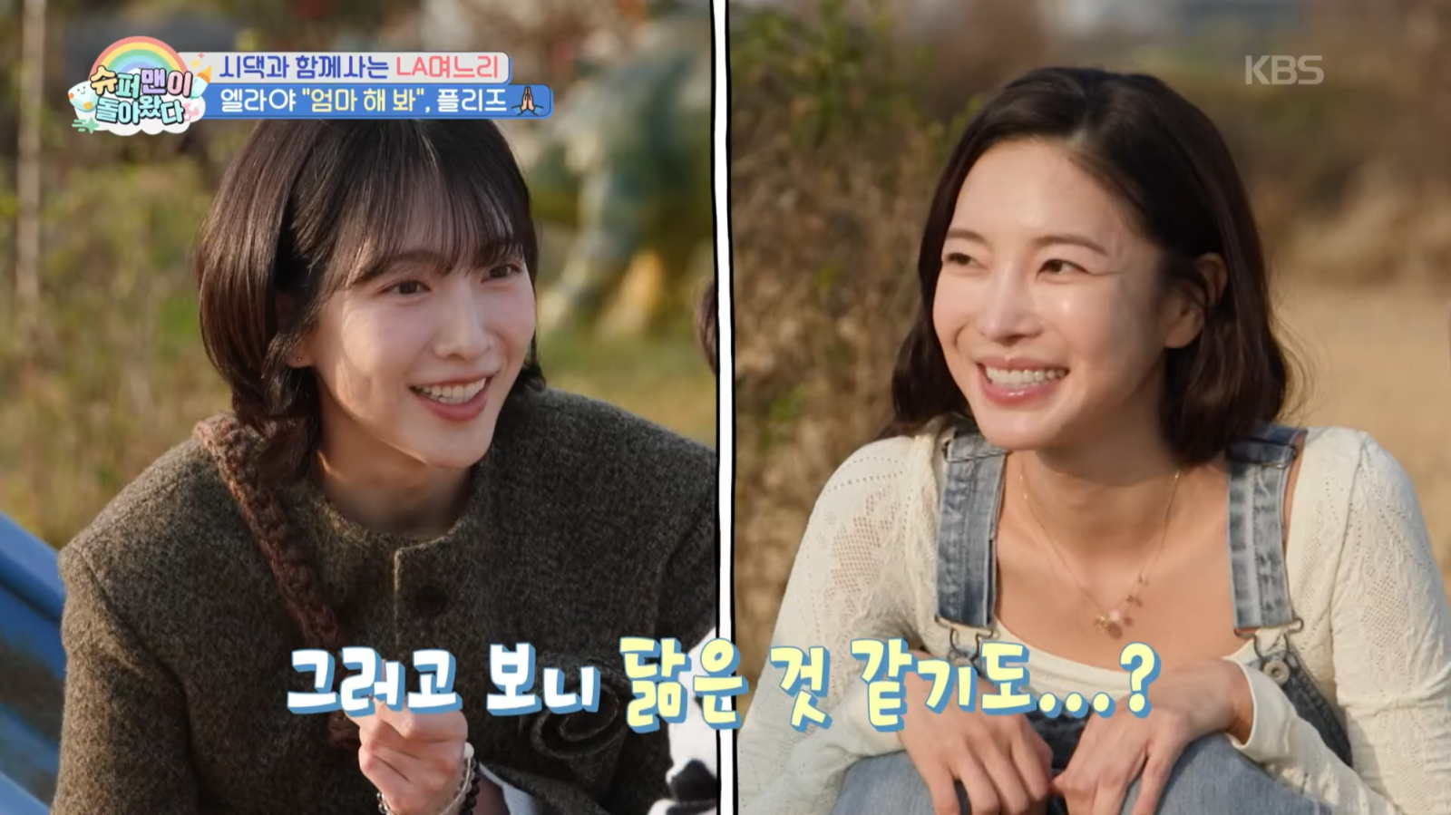 그때 김윤지의 SOS를 받고 찾아온 구원투수는 카라 강지영. 강지영은 “윤지 언니의 사촌동생이자 엘라의 이모”라며 등장했고, 김윤지는 “외가 첫째와 막내라 어려서부터 각별했다”고 소개했다. 두 사람은 나이 차가 무색한 ‘친자매 같은 케미’를 자랑하며 엘라 돌봄에 합동으로 뛰어들었다.