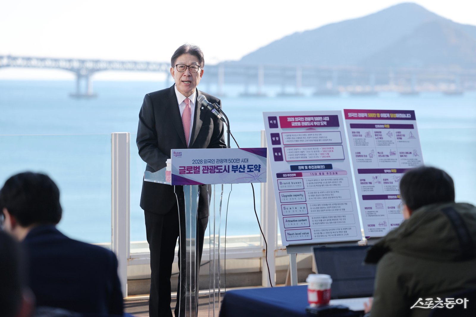 박형준 시장의 외국인 관광객 500만 시대 기자설명회 모습. 사진제공=부산시)