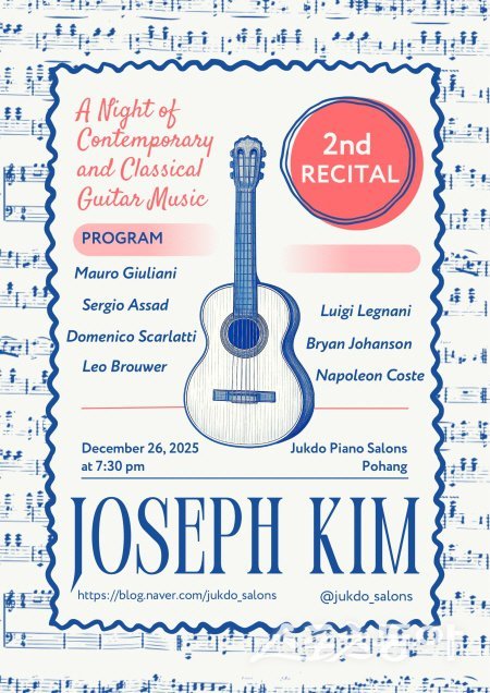 차세대 클래식 기타 연주자로 주목받고 있는 김요셉이 12월 26일 오후 7시 30분, 포항 죽도피아노살롱에서 두 번째 독주회를 연다. 이번 무대는 국내외 콩쿠르에서 잇따른 성과를 거두며 성장세를 입증해온 김요셉이 한 단계 확장된 음악 세계를 선보이는 자리로, 지역 클래식 음악계의 관심을 모으고 있다.이번 독주회는 김요셉의 음악 여정을 되짚고, 앞으로의 가능성을 가늠할 수 있는 무대라는 점에서 의미가 크다. 그는 2025년 한 해 동안 국내외 주요 기타 콩쿠르에서 연이어 입상하며 또래 연주자들 가운데 두각을 나타냈다. Houston Classical Guitar Competition 하이스쿨 부문 1위를 비롯해 University of Rhode Island Guitar Competition 3위, 대전 기타리스트협회 콩쿠르 중등부 1위 등 굵직한 성과를 거두며 국제 무대에서도 경쟁력을 증명했다.