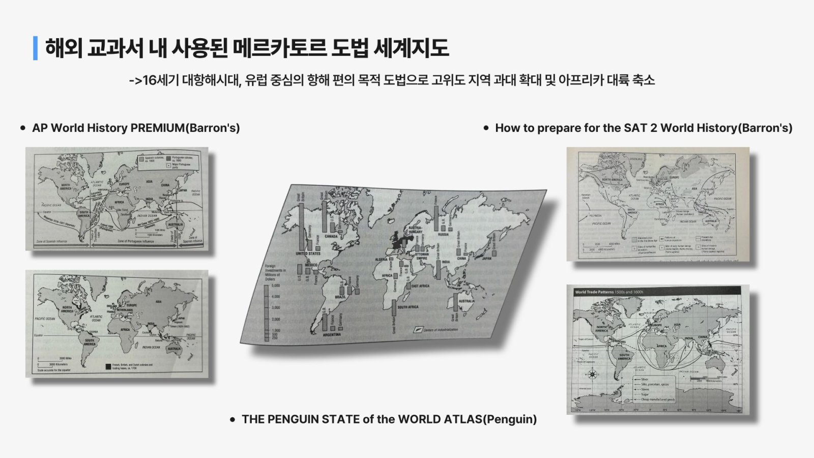 아울러 반크가 그간 문제를 제기해 온 세계지도 표현 방식 역시 이번 조사에서 반복적으로 확인됐다는 점에서 주목된다. 일부 교과서 Penguin 출판『THE PENGUIN STATE of the WORLD ATLAS 』, Barron’s 출판『AP World History: Modern PREMIUM』과 『How to Prepare for the SAT 2 World History』에서는 메르카토르 도법을 그대로 적용한 세계지도가 사용되면서, 아프리카 대륙의 실제 면적과 비중이 축소돼 표현된 사례가 다수 발견된 것이다. 반크는 메르카토르 도법이 항해 목적에는 유용하지만, 교육 현장에서 활용될 경우 대륙 간 상대적 크기를 왜곡해 학습자의 공간 인식을 오도할 수 있다고 지속적으로 지적해 왔다. 실제로 반크가 분석한 교과서 상당수에서 아프리카의 면적이 축소된 형태로 표기된 지도가 반복적으로 수록된 것으로 나타났다.