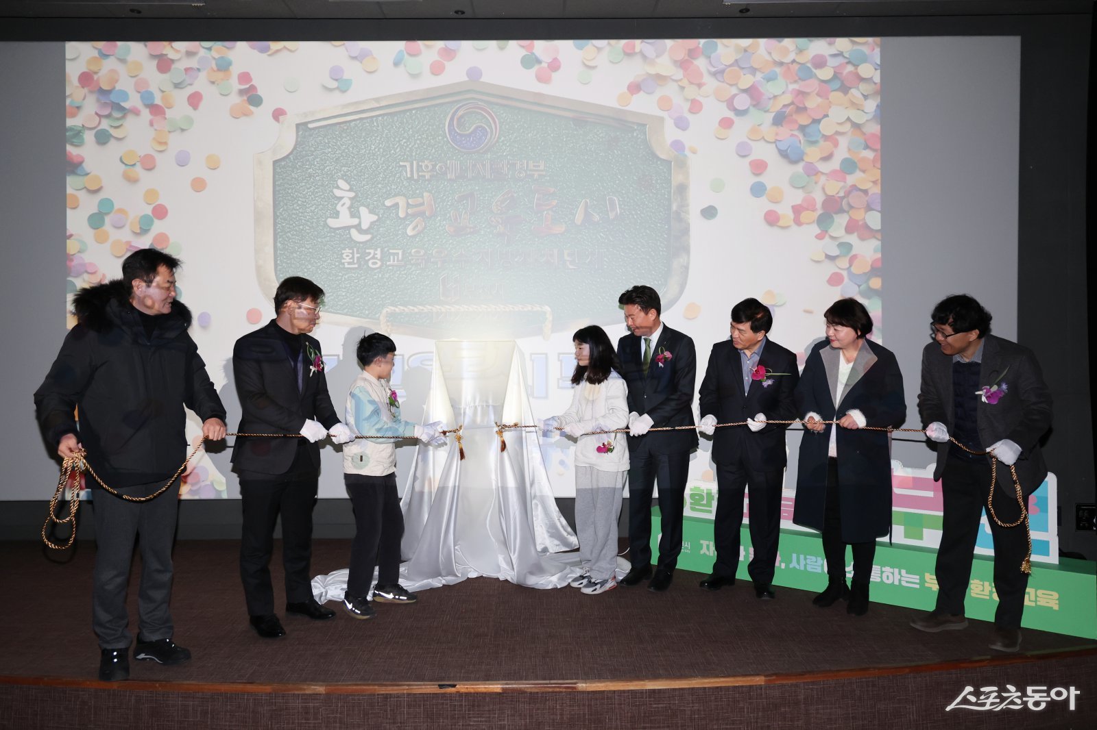 현판 제막식 관계자들이 ‘환경교육도시’ 지정 기념 제막식을 하고 있다. 사진제공|부천시