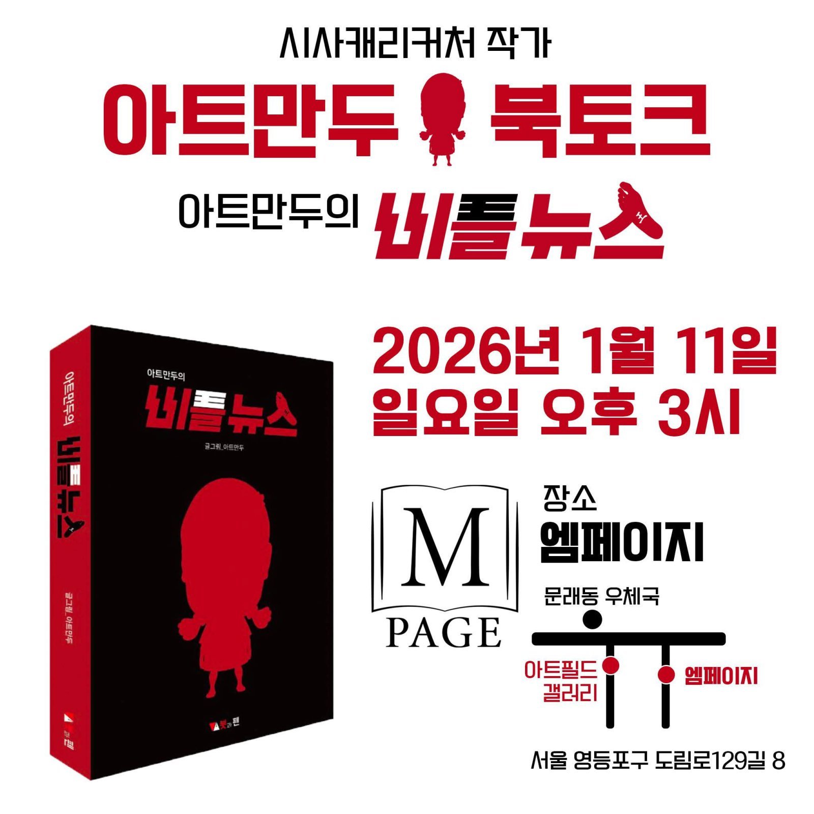 30년 언론 현장을 지켜본 시사 캐리커처 작가 아트만두가 신작 ‘아트만두의 ‘비틀뉴스’’를 출간했다. 윤석열 정부 집권기 주요 장면을 풍자로 재구성한 이번 책은 4년 전 출간한 ‘아트만두의 ‘목표는 방구(防口)다’’ 이후 오랜만에 선보이는 신작이다.