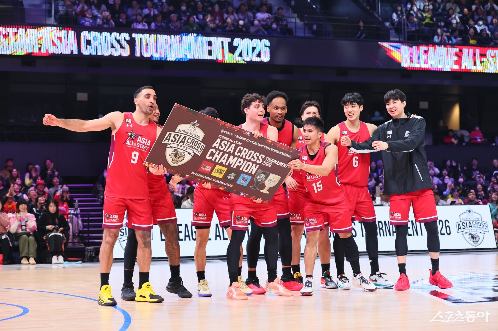 B리그 아시아 올스타팀 선수들이 16일 일본 나가사키 해피니스 아레나에서 열린 아시아 크로스 토너먼트에서 우승을 차지한 뒤 세리머니를 하고 있다. 사진제공|B리그