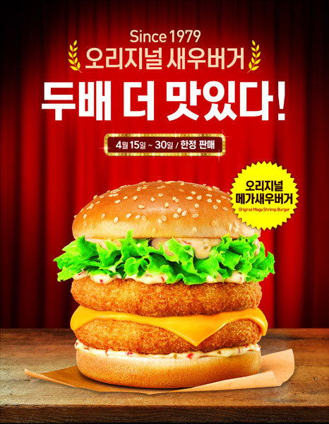 롯데리아가 새우버거 판매 6억개 돌파를 기념해 ‘메가새우버거’를 30일까지 한정 출시한다. 기존 새우버거에 새우패티와 슬라이스치즈를 추가하고 타타르소스의 함량을 늘렸다. 가격은 단품 4500원, 세트 6000원이다. 오전 11시부터 오후 2시까지는 착한점심 메뉴로 5200원에 판매한다.