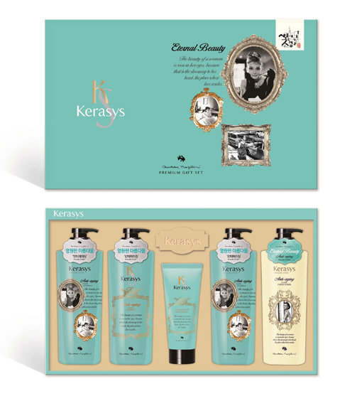 오드리헵번 콜렉션 케라시스 오드리 헵번 스페셜 1호(3만4900원)는 케라시스 뿌리 볼륨 클리닉 샴푸(500ml) 3개, 케라시스 뿌리 볼륨 클리닉 컨디셔너(500ml), 케라시스 볼륨 클리닉 스타일 에센스(200ml)로 구성되어 있다. 케라시스 오드리 헵번 스페셜 2호(4만9900원)는 케라시스 뿌리 볼륨 클리닉 샴푸(500ml) 2개, 케라시스 뿌리 볼륨 클리닉 컨디셔너(500ml), 케라시스 볼륨 클리닉 스타일 에센스(200ml), 케라시스 퍼퓸 퓨어 바디워시(400ml) 3개, 케라시스 리프레시 올리브 앤 그린티 비누(80g) 2개로 구성되어 있다.