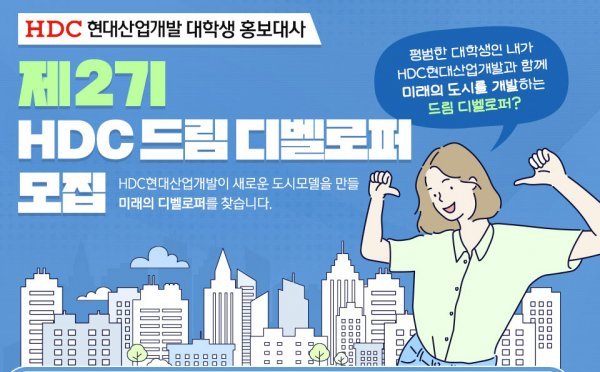 HDC현대산업개발이 9일부터 22일까지 도시개발 특화 대학생 홍보대사 프로그램인 제2기 ‘HDC 드림 디벨로퍼’를 모집한다. 2021년에 이어 두 번째로 운영하는 HDC 드림 디벨로퍼는 서류 및 면접 심사를 거쳐 6월27일부터 10월14일까지 총 16주간 활동하게 된다.최종 선발된 학생들은 HDC현대산업개발이 추진해온 다양한 개발사업 사례를 배우는 한편 지역과 도시가 성장하며 그 안에 머무는 사람들이 소통을 통해 더 나은 미래를 만들어가는 거점 공간으로의 도시개발 개념에 대해 성찰하는 시간을 갖는 등 디벨로퍼로서 개인 역량을 키워갈 수 있는 기회를 갖게 된다.