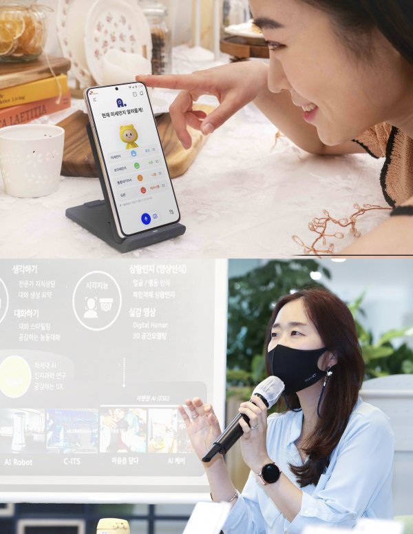 최근 안드로이드 오픈베타 버전을 선보인 SK텔레콤의 성장형 AI 서비스 ‘에이닷’(위쪽 사진). KT의 AI 연구 방향을 설명하고 있는 배순민 KT 융합기술원 AI2XL연구소장. 사진제공|SK텔레콤·KT