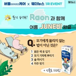 웨더뉴스 SNS 채널에서 두 차례에 걸쳐 진행한다. 1차는 15일부터 19일까지 진행했고, 29일부터 7월3일까지 2차 이벤트를 실시한다. 이벤트에 참여하려면 웨더뉴스 SNS 계정을 팔로우 하고 이벤트 게시글에 댓글로 퀴즈의 정답을 작성하면 된다. 정답자 중 추첨을 통해 각각 25명씩 총 50명에게 버물이카리딘케어를 선물로 증정한다. 버물이카리딘케어는 해충 기피 성분인 이카리딘을 함유한 제품으로, 모기나 털진드기 등의 벌레 기피에 효과가 있는 해충기피제다.