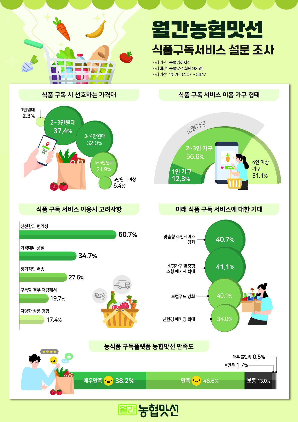 농협의 농식품 구독서비스 월간농협맛선이 론칭 2주년을 맞아 구독회원 대상 920여 명을 대상으로 실시한 설문조사 결과가 이목을 끈다.