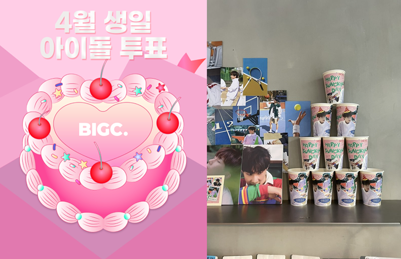 ‘4월 생일 아이돌’ 투표 이미지(왼쪽)와 실제로 진행된 1위 아티스트 ‘인피니트 성규’ 생일카페 현장. 사진제공ㅣ빅크(BIGC)