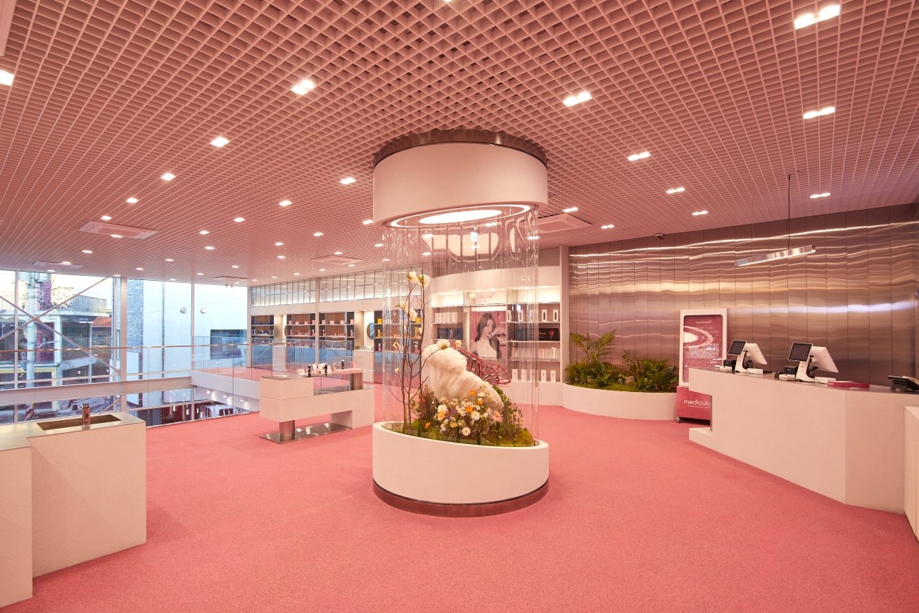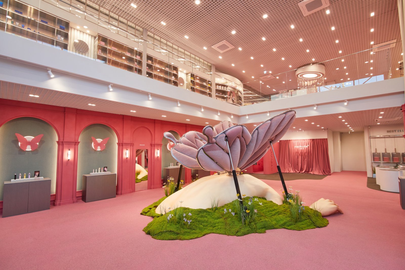 450㎡ 규모로, 브랜드 정체성을 시각적으로 표현했다. 내부는 ‘핑크 페어리(요정)’라는 콘셉트 아래 분홍, 흰색, 메탈 소재 등을 조합한 인테리어로 신비로우면서도 고급스러운 분위기를 조성했다. 또 매장 입구에 분홍 날개를 단 핑크 페어리 오브제를 세워 ‘피부가 다시 날개를 얻는 순간’이라는 메시지를 강조했다. 이동 동선 역시 해당 오브제로부터 자연스럽게 확장되도록 설계했다.