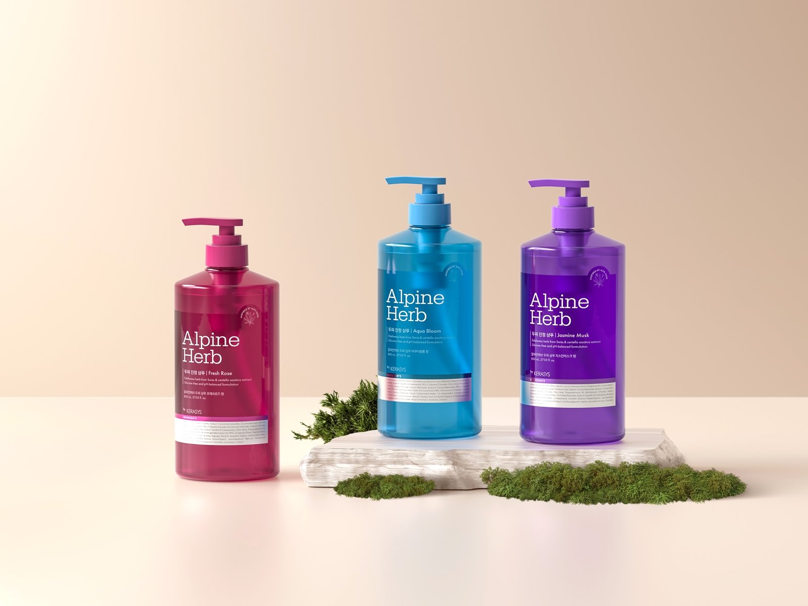 에델바이스 추출물을 함유해 두피와 모발을 건강하게 관리한다. 미네랄이 풍부한 초정 탄산수와 시카 성분이 민감한 두피를 진정시키고, 손상된 모발을 윤기 있게 케어한다. 샴푸의 풍성한 거품이 저자극 딥 클렌징을 도와 두피의 유분을 깨끗하게 세정하며, 컨디셔너는 무실리콘 처방에도 부드러운 사용감을 유지했다. 시원한 아쿠아 향의 ‘아쿠아 블룸’, 핑크 로즈 향의 ‘프레쉬 로즈’, 자스민 향의 ‘자스민 머스크’ 등 샴푸·컨디셔너 각 3종씩 총 6종으로 구성했다.