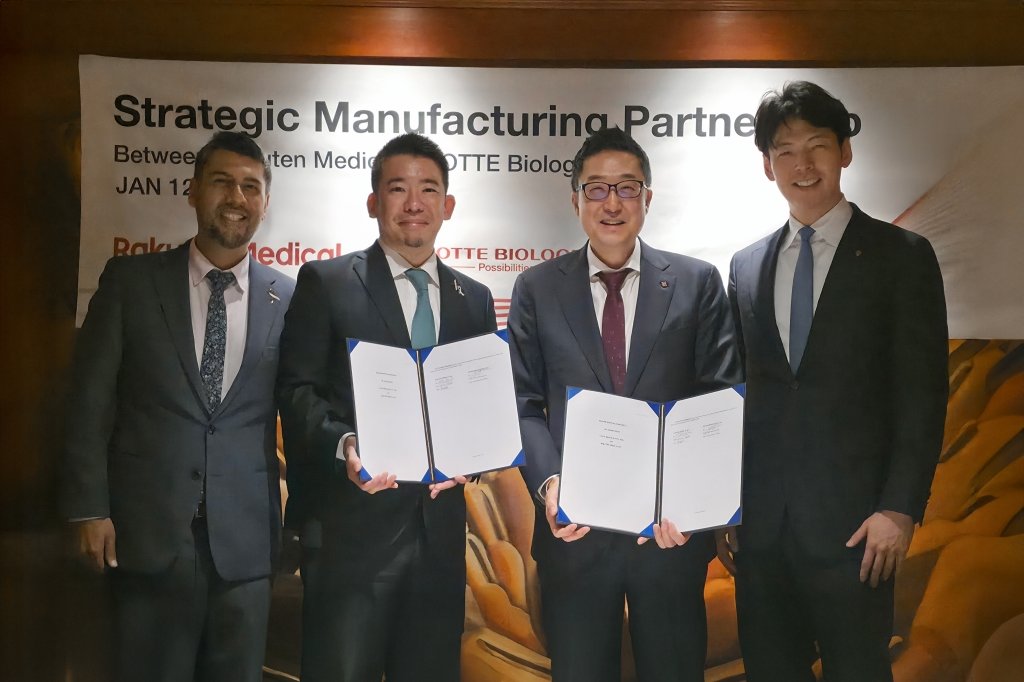 선두주자는 롯데바이오로직스로, 콘퍼런스 현장에서 라쿠텐메디칼과 바이오 의약품 위탁생산(CMO) 계약을 체결했다. 계약 대상 품목은 라쿠텐메디칼의 대표 파이프라인으로, ‘광면역요법’을 기반으로 한 두경부암 치료제다. 광면역요법은 표적 항체에 빛 반응성 물질을 결합한 뒤 종양 부위에 적색광을 조사해 표적 세포를 선택적으로 파괴함으로써 효과와 안전성을 높인 혁신적 기전의 치료법이다.