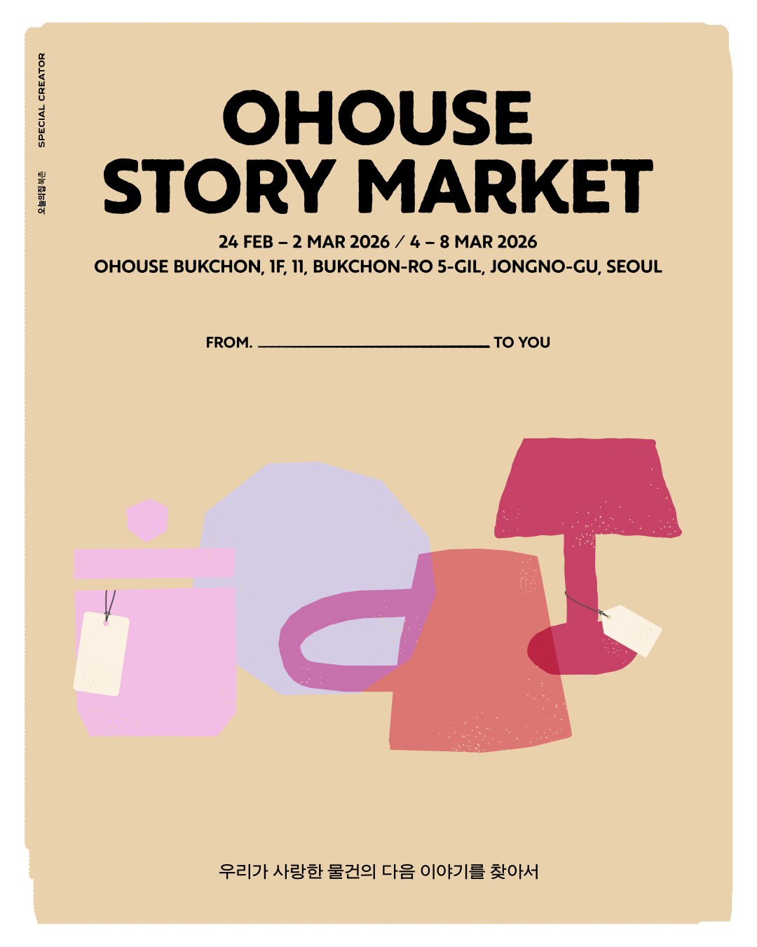 방문객이 직접 참여할 수 있는 체험 프로그램도 이목을 끈다. 크리에이터의 취향과 이야기가 담긴 ‘스토리맵’, 물건의 사연에 답장을 보내는 ‘스토리 인증존’, 스쿱으로 아이템을 담아 5개 구성 상품을 가져갈 수 있는 ‘스쿱마켓’, 플리마켓 구매자 대상 100% 제공되는 ‘히든 리빙템 뽑기’ 등으로 구성했다. 또 판매일 방문 선착순 10인 대상 50% 할인, 스토리 마켓 한정 굿즈 제공, SNS 인증 이벤트 등도 마련했다.