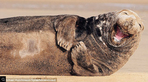 19일 영국 데일리메일에 실린 이 사진은 자연을 전문적으로 촬영하는 사진작가 마이클 허친슨이 몸무게가 무려 230kg이 나가는 바다표범이 하품을 하고 있는 순간을 촬영한 것이다. 실제로는 하품을 하는 모습이지만 눈의 모양이나 입꼬리 등을 보면 마치 신나게 웃고 있는 모습을 연상시킨다.