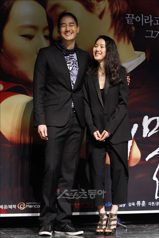 배우 유지태와 윤진서가 ‘올드보이’ 이후 7년 만에 호흡을 맞춘 영화 ‘비밀애’의 제작보고회가 24일 오후 서울 이화여교 100주년 기념관에서 열린 가운데, 두 주인공이 다정하게 포토타임을 갖고 있다.