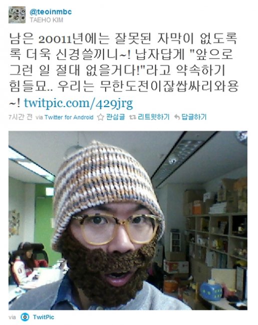 김태호 PD는 최근 ‘무한도전’의 자막 실수에 대해 “남은 20011년에는 잘못된 자막이 없도록 더욱 신경쓸끼니!”라며 “납자답게 ‘앞으로 그런 일 절대 없을거다’라고 약속하기 힘들묘. 우리는 무한도전이잖쌉싸리와용!”이라는 글과 함께 코믹한 사진을 트위트에 올렸다.