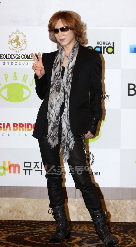 일본의 전설적인 록그룹 '엑스재팬'의 리더 요시키가 26일 오후 서울 구로구 신도림동 쉐라콘 디큐브시티호텔에서 열린 공식 기자회견을 마친 후 포토타임을 갖고 있다.