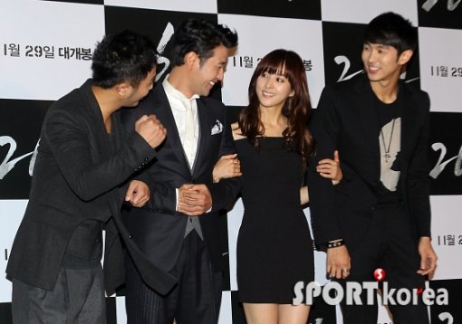 26일 오후 서울 롯데시네마 건대입구점에서 열린 영화 ‘26년’(감독 조근현) VIP 시사회에 참석한 주연배우들이 포토월에서 대화를 나누고 있다.