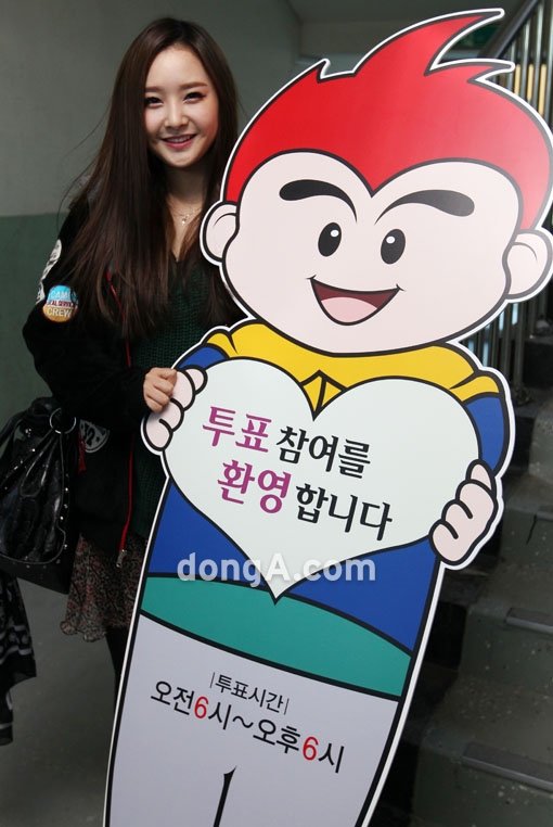 걸그룹 달샤벳의 멤버 우희가 제18대 대통령 선거일인 19일 오전 서울 강서구 화곡초등학교에 마련된 투표소에서 마스코트 모형물 앞에서 포즈를 취하고 있다.