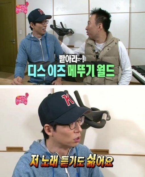 '메뚜기월드'를 들은 유재석은 "단조롭다. 바뀐게 하나도 없다. 곡이 맘에 안 든다"며 곡을 바꿔달라고 요청했다.