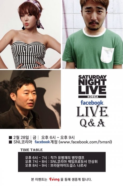 오는 28일 오후 6시부터 9시까지 ‘SNL 코리아’ 페이스북(facebook.com/tvnsnl)에서 진행되며, ‘SNL 코리아’ 시청자로서 궁금한 점이 있는 사람은 누구나 참여 가능하다.