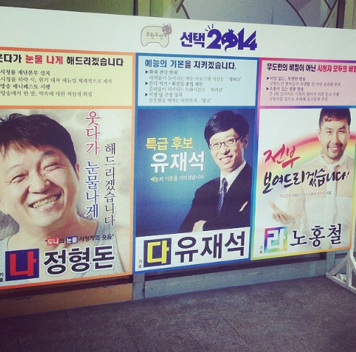 사진에는 ‘무한도전’ 차세대 리더 선거에 출마한 멤버 정형돈, 유재석, 노홍철의 포스터가 포착돼 있다. 이들은 향후 10년 동안 ‘무한도전’을 이끌어 갈 차세대 리더의 자리에 오르기 위해 선거에 출마했다. 박명수, 정준하, 하하는 낮은 지지율 등의 이유로 출마를 포기했다.