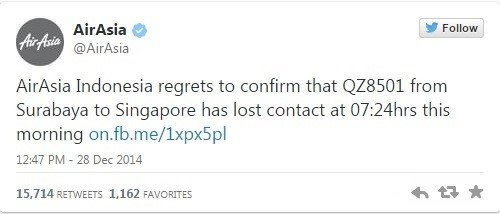 에어아시아 항공기 실종. 사진=에어아시아 트위터.