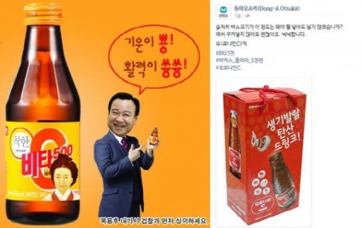 이 소식이 전해진 후 각종 인터넷 커뮤니티에는 ‘비타500 박스’ 패러디물이 속속 올라오고 있다. 특히 눈에 띈 것은 ‘비타500’ 광동제약의 라이벌 제품이 즐비한 동아오츠카 회사 SNS.